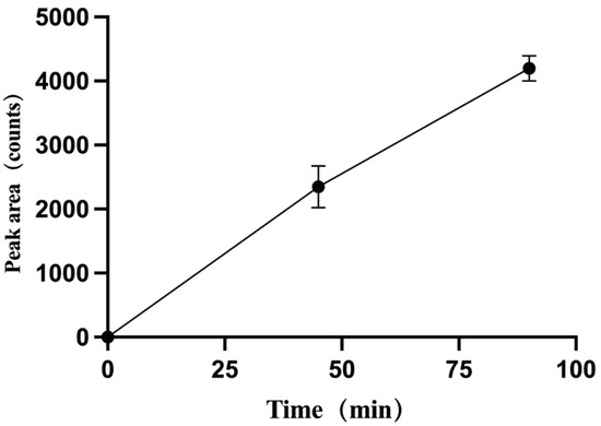 Following the QTRAP workflow for metabolic product identification, screening modes of pMRM-IDA-EPI and Pre-IDA-EPI were established. Quantification of metabolites was performed using MultiQuant 3.0.3 software, with mass spectrometry diagrams for TPB15 and its metabolites depicted in Figure 6a,b. The precursor ion of TPB15 [M + H]+ exhibited an m/z of 453.9 and produced daughter ions at m/z of 127 and 100. A metabolite [M + H]+ was observed at an m/z of 469.9, yielding daughter ions with m/z of 143 and 116. This metabolite, not detected at 0 min, was observed in both the 45 min and the 90 min samples, with increasing amounts over time. Consequently, this product is identified as a metabolite of TPB15 in human liver microsomes. The peak area changes over time for this metabolite are illustrated in Figure 7. Compared to TPB15, the metabolite’s molecular weight increased by 16 Da, suggesting that the metabolic reaction of TPB15 in human liver microsomes involves oxidation, characterizing the metabolite as an oxidation product. Considering the structural features of TBP15, which contains a pyridine ring and a five-membered nitrogen-containing heterocycle, as well as the involvement of CYP3A4 and CYP2C9 in metabolism, we propose that oxidation most likely occurs at the N position of the pyridine ring. This hypothesis is supported by the metabolic characteristics of CYP enzymes: CYP3A4 and CYP2C9 preferentially catalyze oxidation at electron-rich sites, including aromatic and heteroaromatic rings. Pyridine oxidation typically occurs at the nitrogen atom (forming N-oxide) or at the C4 position due to its electronic properties. The observed time-dependent increase in the metabolite’s peak area further supports enzymatic oxidation rather than spontaneous degradation. While these findings strongly suggest oxidation at the pyridine C4 position, further structural characterization such as NMR analysis would be required for definitive confirmation.