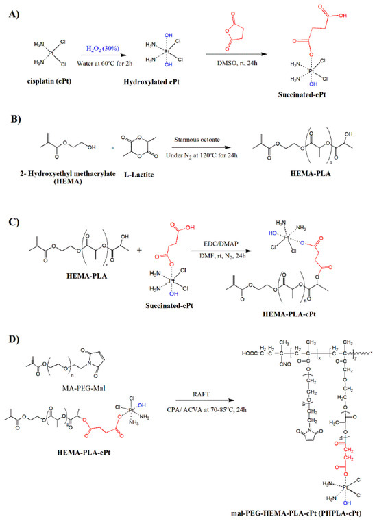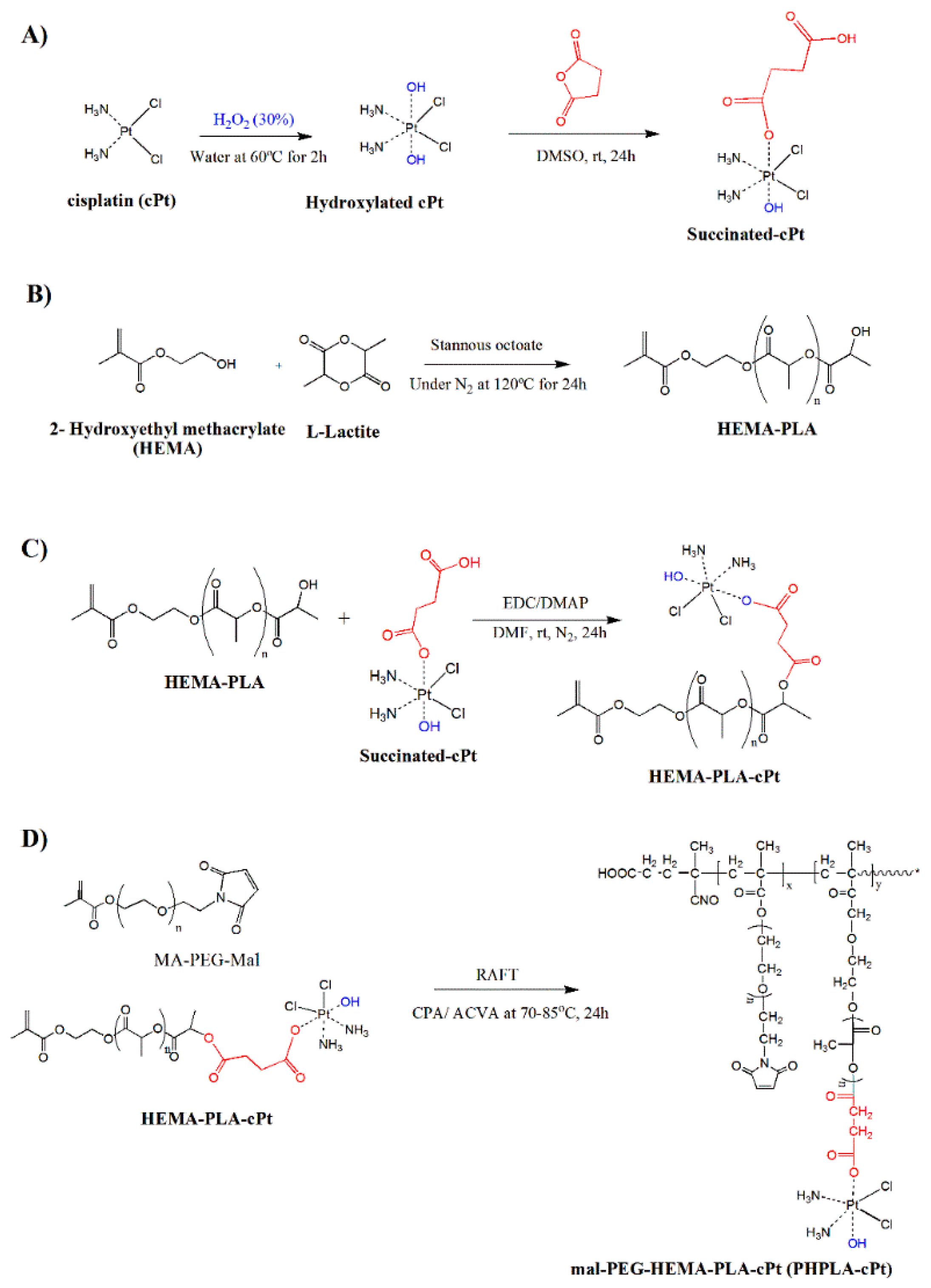 Synthesis scheme of cisplatin–polymer conjugate. (A) Succinated cisplatin synthesis from hydroxylated cisplatin and succinic anhydride at 1:1 molar ratio. Hydroxylated cisplatin was obtained by treatment of hydrogen peroxide; (B) HEMA–PLA synthesis by ring–opening polymerization of L–lactide with 2–Hedroxyethyl methacrylate at 5.6:1 molar ratio; (C) synthesis of HEMA–PL–cPt conjugate from hydroxyethyl methacrylate polylactide and succinated cisplatin at 1:1 molar ratio using carbodiimde reaction; (D) RAFT polymerization of MA–PEG–mal and HEMA–PLA–cPt at 10:1 molar ratio to obtain mal-PEG-HEMA-PLA-cPt (PHPLA–cPt).