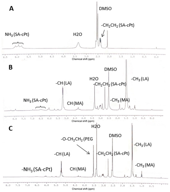 Proton NMR spectra of SA-cPt conjugate (A), HPLA-cPt conjugate (B), and PHPLA-cPt copolymer (C). DMSO-d6 is used to dissolve all samples before measuring them by NMR. LA represents Lactate, MA represents methacrylate moiety, and SA represents succinic acid residue.