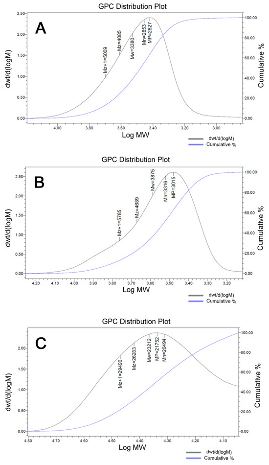 GPC results for macromonomers and polymers. (A) represents HEMA-PLA macromonomer in THF, (B) represents HEMA-PLA-cPt conjugate, and (C) represents PHPLA-cPt polymer.