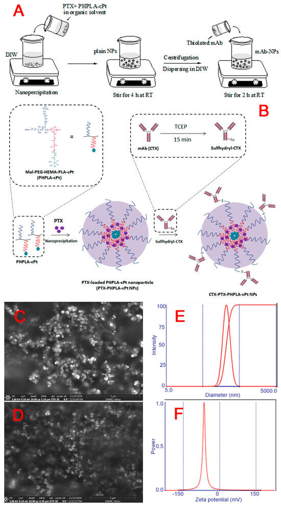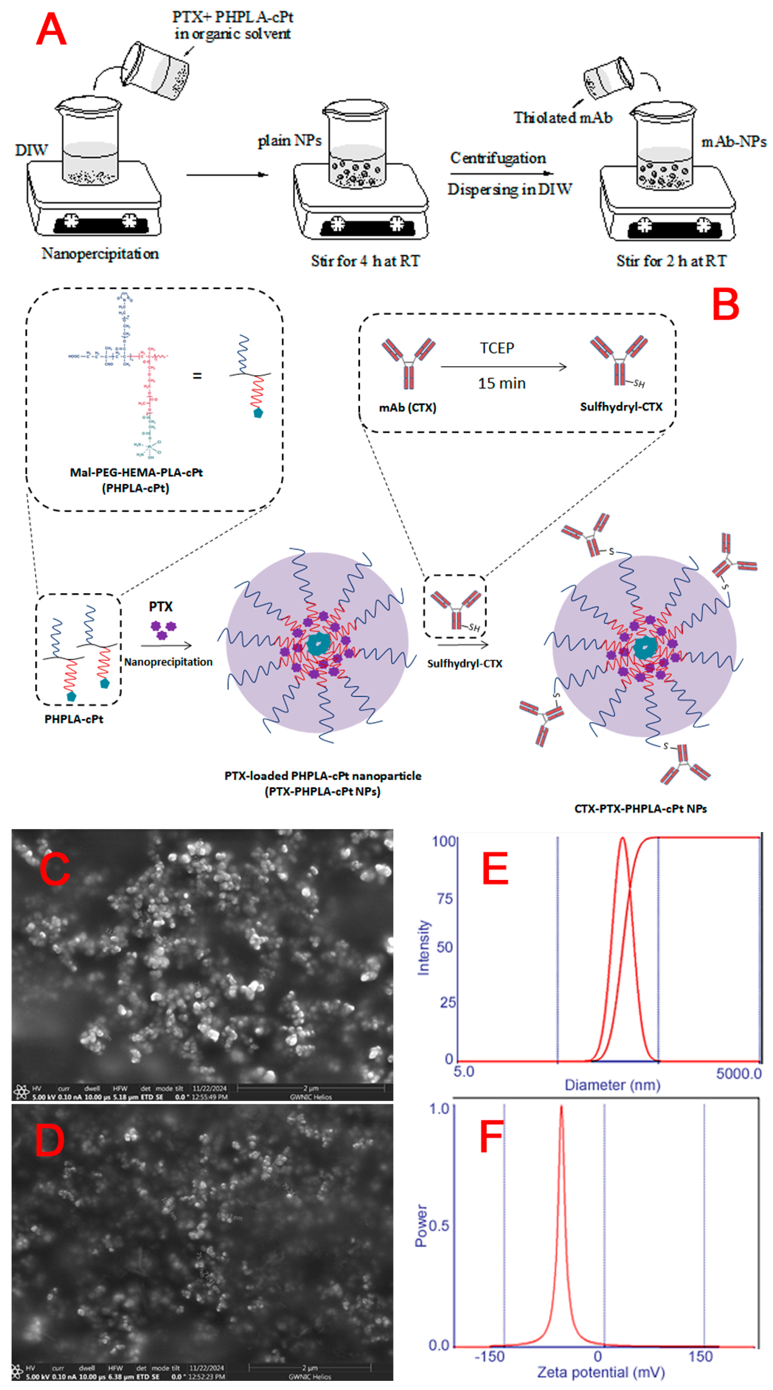 (A) Fabrication of nanoparticles using nanoprecipitation method. (B) Scheme of preparation of nanoparticles containing PTX and cisplatin and attachment of cetuximab (CTX) to their surfaces. The upper left panel presents the modeling of Mal-PEG-HEMA-PLA-cPt copolymer; the upper right panel describes how TCEP can reduce disulfide linkage in mAb. Size and morphology of CTX-PTX@PHPLA-cPt NPs: (C,D) SEM images of the CTX-NPs and p-NPs, (E) mean diameter, and (F). zeta potential of the CTX-NPs by DLS.