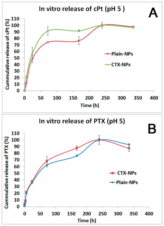 In vitro release study. (A) Cumulative release profile of cisplatin (cPt) from both plain NPs and CTX-attached NPs at pH 5.0; (B) cumulative release profile of paclitaxel (PTX) from both plain NPs and CTX-attached NPs at pH 5.0.