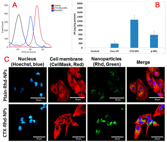 (A) After 3 h of incubation at 37 °C, the cells were analyzed by flow cytometer to characterize the uptake of Rhd-NPs and CTX-Rhd-NPs. Here, rhodamine (Rhd) was applied as a payload that has a fluorescence signal instead of a PTX molecule. (B) After 3 h of incubation at 37 °C, cellular uptake of cisplatin was measured by AAS. The cisplatin content was normalized based on the protein amount in the cells using BCA assay [48]. ANOVA table shows that there is a statistically significant difference among the three treatment groups (free cisplatin (free cPt), plain nanoparticles (p-NP), and monoclonal antibody conjugated nanoparticles (CTX-NP) (p < 0.01). Treatment contrasts p-NP versus CTX-NP (p < 0.01); free cPt versus CTX-NP (p < 0.01; and free cPt versus p-NP (p < 0.01). (C) Cellular uptake of plain Rhd-NPs and CTX-Rhd-NPs by confocal microscope after 48 h of incubation in MDA-MB-231 cells. Hoechst (blue) indicates the nucleus, CellMask Red (red) indicates the cell membrane, and Rhd (green) presents rhodamine 123 as a payload.