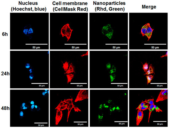 Cellular uptake of CTX-Rhd-NPs by confocal microscope after incubation for 6 h, 24 h, and 48 h in MDA-MB-231 cells. Hoechst (blue) indicates the nucleus, CellMask Red (red) indicates the cell membrane, and Rhd (green) presents rhodamine 123 as a payload.