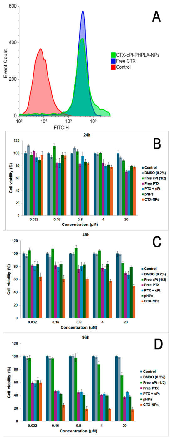 (A). Cell binding of CTX-NPs on MDA-MB-231 cell line by FACS. All groups were stained with PI, and FITC-labeled IgG secondary antibody was added to the groups treated with CTX-NPs (CTX-PTX-PHPLA-cPt-NPs) and free CTX. Cytotoxicity study by CellTiterGlo luminescence assay: Cell cytotoxicity results at 24 h (B), 48 h (C), and 96 h (D) after treatment with free cPt and PTX, combination of cPt and PTX, drug-loaded plain nanoparticle (p-NPs), and antibody-attached nanoparticles (CTX-NPs) against MDA-MB-231 cell line at 37 °C were shown. The IC50 values of CTX-NPs, p-NPs, and PTX + cPt after 96 h of incubation were 0.1 µM, 0.49 µM, and 0.57 µM, respectively.
