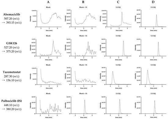 The developed method for the quantification of abemaciclib, GSK126 and tazemetostat had a runtime of 7.5 min. Representative chromatograms of blank samples (double-blank and blank plus IS) and calibration standards at the LLOQ and ULOQ are shown in Figure 2.