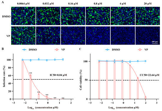 VP displays dose-dependent anti-SFTSV activity and low cytotoxicity. (A,B) Huh7 cells were incubated with SFTSV (MOI = 1) in the presence of VP or DMSO at 37 °C for 24 h. The inhibition rate of VP was analyzed via an IF assay. The SFTSV was stained with the primary anti-SFTSV NP mAb and goat anti-mouse Alexa Fluor™ 488 secondary antibody (green). Nuclei were stained with DAPI (blue). (C) Huh7 cells were incubated with the indicated concentrations of VP at 37 °C for 24 h, and the cytotoxicity was detected by a CCK-8 assay. Data were shown as means with a SD of three independent experiments. Scale bar, 200 μm. ** p < 0.01 compared to the control group.