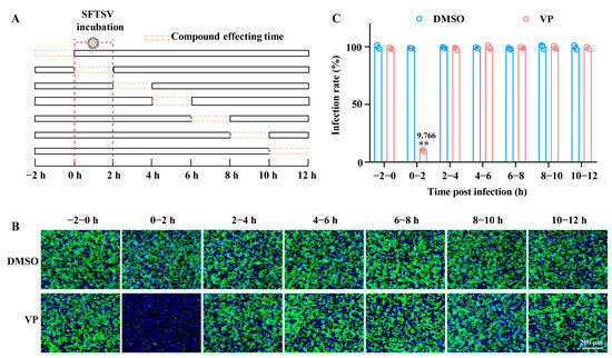 VP acts during the 0–2 h time window of the SFTSV infection. (A) A schematic diagram of the time window of the compound-affecting assay. (B,C) Huh7 cells were incubated with SFTSV (MOI = 1) at 37 °C for 2 h and treated with VP (4 μM) during −2–0, 0–2, 2–4, 4–6, 6–8, 8–10, and 10–12 h, respectively. The cells were detected by an IF assay 12 h after the virus inoculation. The SFTSV was stained with the primary anti-SFTSV NP mAb and goat anti-mouse Alexa Fluor™ 488 secondary antibody (green). Nuclei were stained with DAPI (blue). Data were shown as means with a SD of three independent experiments. Scale bar, 200 μm. ** p < 0.01 compared to the control group.
