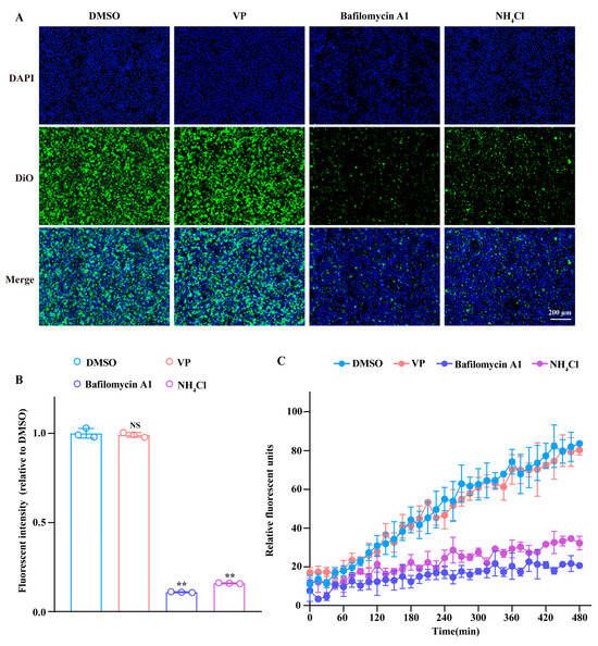 VP does not affect SFTSV membrane fusion. (A,B) Huh7 cells were inoculated with DiO-labelled SFTSV (SFTSVDiO, MOI = 1) in the presence of VP (4 μM), bafilomycin A1 (20 nM), NH4Cl (20 mM), or DMSO at 37 °C for 2 h. Then, the fluorescent intensity of DiO (green) was detected by the BioTek Lionheart FX Imaging Reader. Nuclei were stained with DAPI (blue). (C) Huh7 cells were incubated with SFTSVDiO (MOI = 1) in the presence of VP (4 μM), bafilomycin A1 (20 nM), NH4Cl (20 mM), or DMSO. Then, the fluorescent units were collected every 15 min for a total of 33 cycles. Data were shown as means with a SD of three independent experiments. Scale bar, 200 μm. ** p < 0.01 compared to the DMSO group. NS, no significance compared to the DMSO group.