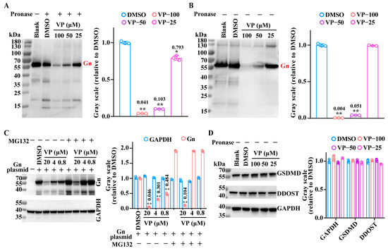 Degradation of the viral Gn protein by VP. (A) The Gn protein was pre-incubated with VP at the indicated concentrations (100 μM, 50 μM, and 25 μM) or DMSO for 1 h and subsequently digested using pronase for 30 min at room temperature. The influence of VP on Gn was analyzed by a Western blotting assay. (B) The Gn protein was incubated with VP at the indicated concentrations (100 μM, 50 μM, and 25 μM) or DMSO for 1.5 h, and the Gn was detected by a Western blotting assay. (C) The HeLa cells transfected with the Gn plasmid were treated with VP (20 μM, 4 μM, and 0.8 μM) and the proteasome inhibitor MG132 (10 μM) for 2 h. Then, the degradation effect was detected by a Western blotting assay. (D) The DDOST and GSDMD in cell lysates were incubated with the indicated concentrations of VP (100 μM, 50 μM, and 25 μM) for 1.5 h, and the influence of VP on DDOST and GSDMD was analyzed by a Western blotting assay. Data were shown as means with a SD of three independent experiments. ** p < 0.01 compared to the DMSO group. * p < 0.05 compared to the DMSO group.
