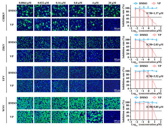 Finally, we evaluated the inhibitory effect of VP against other arboviruses. As shown in the results, the infection of the chikungunya virus (CHIKV), Zika virus (ZIKV), yellow fever virus (YFV), and West Nile virus (WNV) was markedly suppressed following VP treatment in a dose-dependent manner in Huh7 cells. The inhibition rate order of VP according to the IC50 values for these viruses is as follows: CHIKV (IC50: 1.37 μM), ZIKV (IC50: 2.03 μM), YFV (IC50: 3.52 μM), and WNV (IC50: 5.85 μM) (Figure 7).