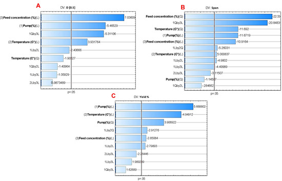 Pareto charts of the effect of the assessed independent variables on (A) D[0.5], (B) span, and (C) yield (%). Bars exceeding the vertical line indicate that the terms are significant (p < 0.05).
