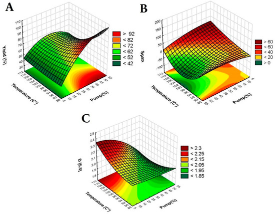 Three-dimensional surface plots of the effect of temperature (°C) and pump (%) on (A) yield (%), (B) span, and (C) D[0.5].