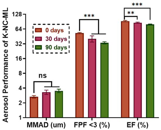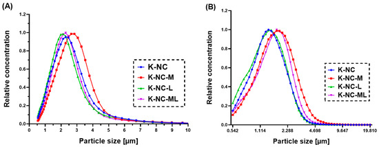 Figure 4 presents the volume size and number particle size distributions of NC-DP samples. K-NC-M exhibited the broadest distribution with larger particle sizes (Figure 4A), which may hinder deep lung deposition. In contrast, K-NC-L and K-NC-ML demonstrated narrower, more favorable distributions, suggesting improved aerosol performance.