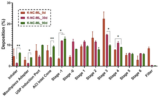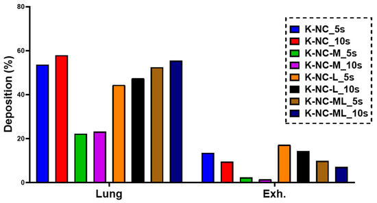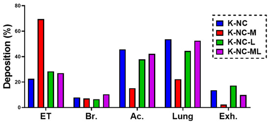 The inclusion of mannitol in K-NC-M increased the particle size and broadened the size distribution, leading to reduced lung deposition and higher extra-thoracic deposition, consistent with in vitro trends. However, K-NC-M also had the lowest exhaled fraction among all samples, likely due to its larger particle size reducing the likelihood of exhalation. In contrast, K-NC-L, which exhibited the highest aerosol performance in vitro due to its small particle size and narrow distribution, showed a higher exhaled fraction in silico. This may be because its smaller particles are more prone to exhalation in the simulated respiratory tract, whereas the APS results reflect superior dispersibility under controlled in vitro conditions.