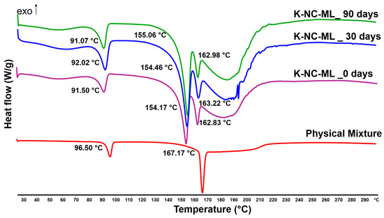 Differential scanning calorimetry (DSC) was carried out by operating a Mettler Toledo DSC 821e system, controlled by STARe thermal analysis software version 9.3 (Mettler Inc., Schwerzenbach, Switzerland). For the analysis, approximately 2–3 mg of each sample and physical mixture (corresponding to sample compositions) was sealed in hermetically closed aluminum pans with pierced lids, while an empty pan served as the reference. The temperature was scanned from 25 °C to 300 °C at a heating rate of 10 °C/min, using argon as the carrier gas with a flow rate of 10 L/h.