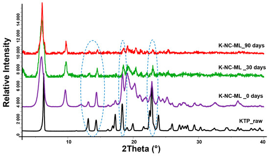 The samples and KTP raw were investigated using a BRUKER D8 Advance X-ray powder diffractometer (Bruker AXS GmbH, Karlsruhe, Germany) for structural analysis. The system utilized a Cu Kα1 radiation source (λ = 1.5406 Å) and a VÅNTEC-1 detector. Scans were performed with a copper target and nickel filter, operating at 40 kV and 40 mA. The measurements covered a 2θ range of 3° to 40°, with a step size of 0.01° and a step time of 0.1 s.
