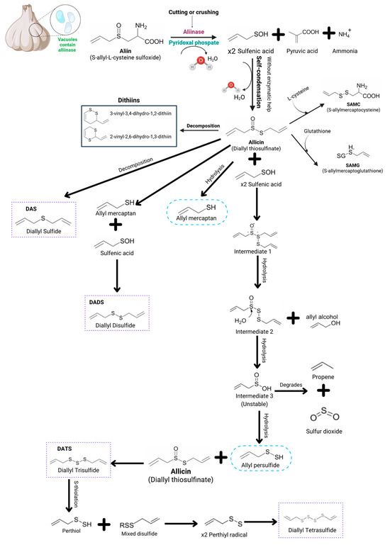 Schematic diagram that features the alliinase enzyme action mechanism for the formation of thiosulfinates and polysulfides. Here, the diagram shows that once alliinase is released from the vacuoles, it encounters alliin, by initiating a cleavage in the carbon–sulfur bond within amino acids. It leads to the formation of an unstable complex that undergoes dehydration in the presence of pyridoxal phosphate that results in three intermediates: sulfenic acid, pyruvic acid and ammonia. This process triggers a series of reactions from allicin, ultimately transforming into thiosulfinates and polysulfides such as diallyl sulfide, diallyl disulfide, diallyl trisulfide, diallyl tetrasulfide, γ-glutamyl, and S-allylcysteine derivatives like S-allylcysteine (SAC) and S-allylmercaptocysteine (SAMC), along with ajoenes [3,7,9,18,19,20,23,24,25,26,27,28,29,30].