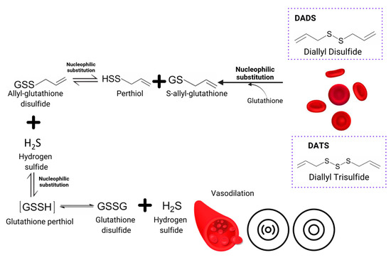 Schematic diagram that features the DADS and DATS conversion into hydrogen sulfide by the erythrocyte. It is a phenomenon known as the endothelium-derived relaxing factor mechanism, which ends in vasodilation [2,10].
