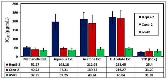 Cancer is a group of diseases characterized by malignant neoplasms arising from uncontrolled cell proliferation that invades and destroys the surrounding tissue, leading to death if not controlled [98]. During the present study, it was noticed that the methanolic extract exhibited the highest cytotoxic activity against HepG-2, Caco-2, and A549 cells with the lowest IC50 values (Figure 1). This is consistent with Cruz et al., who demonstrated that cytotoxic activity is related to the chemical composition of the extracts [99]. The extract with the highest cytotoxic activity towards cancer cells might be due to the presence of high concentrations of phenolic compounds, which reduced the viability of cancer cells, as observed in the MTT assay [100]. Huang et al. added that these phenolic and flavonoidal compounds exert their anti-proliferative activity by interacting with cell cycle regulatory effects, thereby reducing the proliferation process [101].