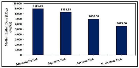 Acute oral toxicity is usually an initial screening step in the evaluation of the toxic characteristics of the studied extracts [106]. The toxicity induced by the extract might be directly related to the doses it is exposed to. The extract might be toxic if given in large enough doses because the difference between the therapeutic purpose and the toxicity is the dose, which increases the toxicity with an increase in dose [107]. The data from the current study showed that the methanolic extract had the highest LD50 value, making it safer than the other studied extracts (Figure 2). This agrees with Luka et al., who postulated that the crude methanolic extract has low toxicity and is safe when administered orally in mice [108].