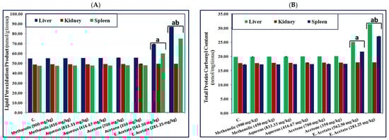 Effect of the different L. sativum seed extracts at two doses (1/10 and 1/20 of LD50) on (A) Concentration of the lipid peroxidation product and (B) total protein carbonyl contents in the most target organs of mice. Data were represented as mean ± SE, a: indicates a statistically significant difference compared to the control group, b: indicates a statistically significant difference compared to the same extract at the higher dose (1/10 of LD50) at p ≤ 0.05.