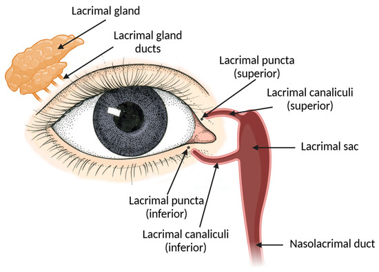 The nasolacrimal drainage system (Figure 3) provides the correct balance between inflow and outflow of tears to the lacrimal sac to guarantee the hydration of the ocular surface and the normal refraction of light in the vision process [53]. It comprises secretory, distributive, and collection parts [54].