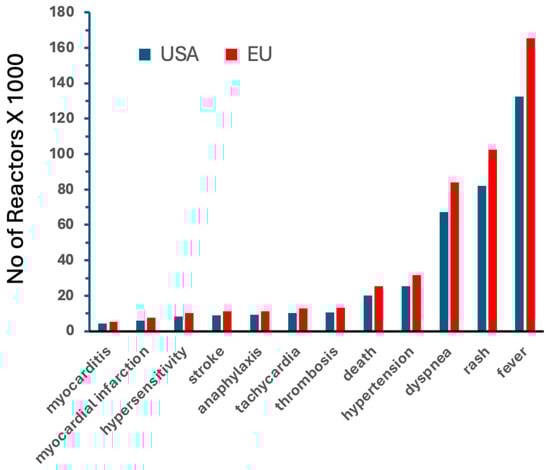 The COVID-19 vaccine-induced AEs are closely monitored in Europe as well. In Germany, the Paul Ehrlich Institute (PEI), a participant in the WHO-led Vaccine Safety Net project, serves as a primary source of statistics on genetic vaccine-induced AEs [28]. According to the PEI, the incidence rate of severe AEs (of special interest) associated with mRNA vaccines was approximately 0.2 per 1000 doses, or 0.02% [28]. For comparison, the corresponding values from various U.S. statistics mentioned earlier in this review were 0.03% [20], 0.13% (VAERS, Table 2), 0.18% [12], and 0.5% [21].