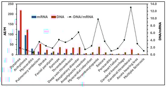 Incidence rates of “special interest” AEs caused by mRNA and DNA-based genetic vaccines in Germany (visual representation of data from Table 4). Blue bars represent the summed incidences (AEs/M) associated with mRNA vaccines (Comirnaty and Spikevax), while red bars represent those associated with DNA vaccines (Jcovden and Vaxzevria). The dotted line (right y-axis) shows the DNA/mRNA ratios, indicating the fold-increase in the incidence of each AE observed with DNA vaccines compared to mRNA vaccines.