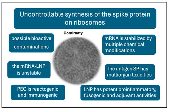 These differences include the following [58]: (i) The highly controlled, multistep pathway of antigen processing and presentation in natural immunogenicity is replaced in mRNA vaccines by uncontrollable ribosomal synthesis of the antigen. This results in a diversification of SP processing and presentation in unnatural ways [58]. (ii) Nucleoside and other chemical modifications increase the stability of the synthetic mRNA, and, hence, the efficacy of SP translation and its in vivo stability [59,60]. (iii) The prefusion-stabilized antigen SP has diverse, multiorgan toxicities [61,62,63]. Its rapid entry into the bloodstream and whole-body tissue distribution [64,65] can cause autoimmune reactions and a variety of cell and tissue damages. (iv) The LNP is a robust proinflammatory agent [66,67] and multiorgan mRNA transfectant [68,69] which underlies systemic inflammation and autoimmune phenomena. (iv) The stabilizer polymer (polyethylene glycol, PEG) on the vaccine nanoparticle surface has anaphylactic reactogenicity and immunogenicity, implying possible anti-vaccine immune reactivity [44,46]. (v) the vaccine nanoparticles are unstable in water [70]. (vi) The injectable vaccine may contain residual DNA fragments, [71], odd molecular assemblies, and inorganic metals and complexes [72]. The above deviations from traditional vaccines offer plausible explanations for the AEs of mRNA vaccines [58], which may be perceived as collateral damage from the otherwise successful fight against COVID-19.