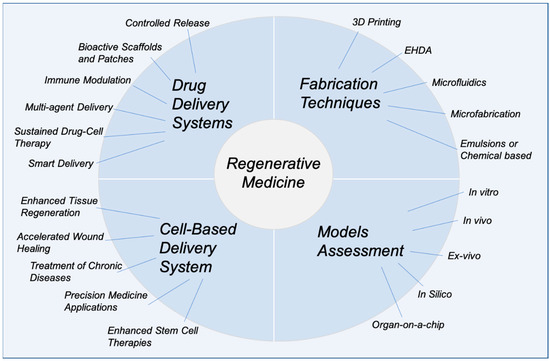 Cell-based delivery systems, in contrast, place an emphasis on the biological aspect of regenerative medicine, with applications such as enhanced tissue regeneration, accelerated wound healing, and precision medicine on an individual patient basis. These systems support the treatment of chronic diseases by improving the survival and functionality of therapeutic cells and by incorporating enhanced stem cell therapies for targeted tissue repair. Fabrication techniques like 3D printing, electrohydrodynamic atomization (EHDA), microfluidics, microfabrication, and emulsions or chemical-based approaches [4,7,8,17] are fundamental in creating such systems, offering unparalleled control over structure and composition. Model assessments, including in vitro, in vivo, ex vivo, in silico, and organ-on-a-chip methods, further enable a comprehensive evaluation of these delivery platforms, ensuring their safety, efficacy, and translational potential at multiple time points during therapy development (Figure 1). This review aims to provide an updated and comprehensive overview of recent advances in drug delivery systems and regenerative medicine, with a particular focus on emerging technologies such as bioprinting, stem cell therapies, and smart nanocarriers. Unlike previous reviews, this work integrates both technological innovations and clinical translation perspectives, while also addressing key challenges and limitations, such as biological barriers, safety concerns, and regulatory hurdles that impact the successful application of these therapies. The literature reviewed includes studies published primarily between 2014 and 2024, along with selected foundational works to provide broader context and deeper insights into the field.