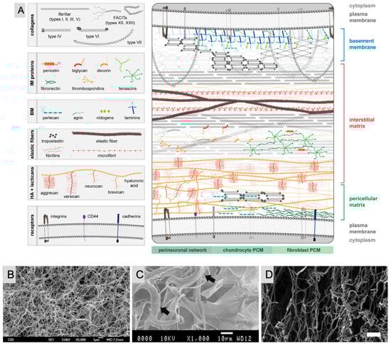 (A) Distribution of key ECM components at the cellular level. The top cell is an epidermal or endothelial cell separated from the interstitial matrix (IM) by the basement membrane (BM). The arrangement of ECM is constant across the native BM, but in the schematic, components are minimized or removed to highlight the relative distribution of BM protein. The BM is connected to the IM through type VII collagen anchoring fibrils and/or type VI collagen. The pericellular matrix (PCM) surrounding the bottom cell is arranged to show differences between the PCM of neurons (perineuronal nets), chondrocytes, and fibroblasts. Reprinted from reference [26] with permission from Elsevier (not to scale). SEM images of biomaterials composed of (B) a purified single ECM protein (pure collagen I hydrogel). Reprinted from reference [30] with permission from Elsevier. (C) Multiple ECM proteins (crosslinked collagen I-elastin scaffold). Arrows indicate points of interaction between collagen and elastin fibers. Reprinted from reference [31] with permission from Elsevier. (D) Tissue-derived materials (decellularized human adipose ECM hydrogel). Reprinted with permission from reference [32]. Copyright (2014) John Wiley & Sons, Inc.