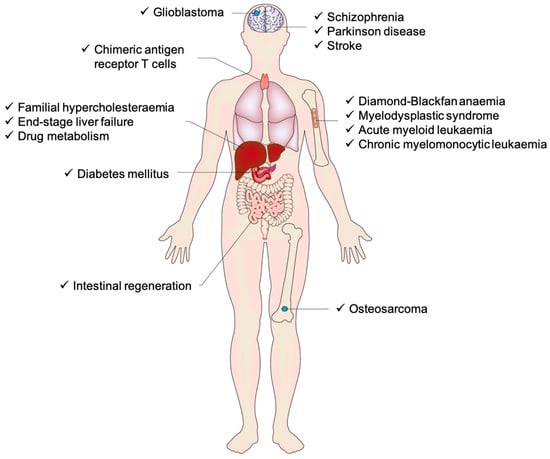 Moreover, the creation of iPSCs involves reprogramming mature somatic cells, such as skin or blood cells, into a pluripotent state by introducing specific transcription factors mentioned above (Oct4, Sox2, Klf4, and c-Myc) through methods like viral vectors or RNA delivery. These factors reset the cells’ epigenetic state, enabling them to “de-differentiate” and regain the ability to develop into various cell types. The reprogrammed cells are then cultured to form iPSC colonies, which can be expanded and further differentiated into specific cell lineages for research or therapeutic purposes. Additionally, tissues derived from iPSCs closely match the cell donor, which is crucial for disease modeling and drug screening studies. It is expected that researchers will utilize iPSCs to learn how to reprogram cells to repair damaged tissues in the human body [42]. With the recent surge in cell-based therapies being investigated in preclinical and clinical settings for numerous diseases, iPSC-based chimeric disease models via xenotransplantation have become an effective way to drive these advancements by accurately replicating human diseases (Figure 3).