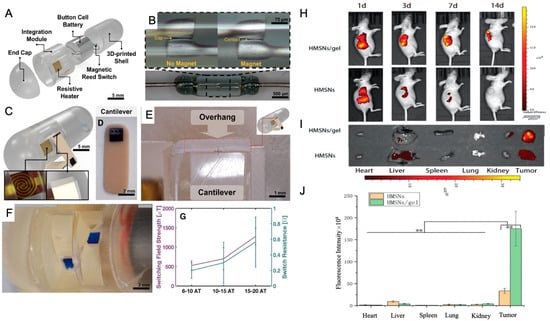 Design overview and magnetic triggering mechanism: (A) Computer–aided design showing the system overview, including the electrical and packaging capsule components. (B) Close–up of the magnetic reed switch in the open and closed states showing the reed gap and contact, respectively. (C) Rendered assembled capsule showing the resistive heating element and the overhang used to restrain the fixed end of the cantilever. (D,E) The cantilever (D) and the cantilever under the overhang (E) that restrains during flexure and releases when relaxed. (F) Magnified view of two cantilevers before deployment. (G) Characterization of the magnetic triggering mechanism showing the switching field strength and switch resistance for different designed switching strengths (n = 3). Data are represented as the mean ± SD. Reprinted and adapted from [76] with permission from Elsevier. In vivo biodistribution and retention were assessed using NIR imaging. (H) NIR real–time images of A549 xenograft models were captured after i.t. injection of DiR@HMSNs formulation and DiR@HMSNs/hydrogel composite on days 1, 3, 7, and 14. (I) NIR images of ex vivo tumors and mean organs were taken on the 14th day post–injection. (J) Quantitative analysis of fluorescence in ex vivo tumors and mean organs was performed. Data are presented as mean ± SD (n = 3), with “**” indicating p < 0.01 [77].