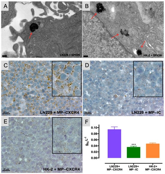 The uptake of SPIONs by LN229 and HK-2 cells is depicted in the transmission electron micrographs. Both LN229 (A) and HK-2 (B) cells internalize SPIONs, which localize within endosomal compartments (highlighted by red arrows) (scale bars are 200 nm). (C–F) Interaction of functionalized MPs with LN229 and HK-2 cells. LN229 cells exhibit greater interaction with CXCR4-targeted particles (C) compared to IC-functionalized particles (D). Additionally, LN229 cells (C) show stronger interaction with CXCR4-targeted nanoparticles than HK-2 cells (E). Images display reconstituted and stained microtome sections (5 μm thickness; scale bars are 20 μm); magnified details are included as insets. (F) Iron quantification by ICP–OES for each condition. Data represent the mean ± SD from two independent experiments. *** p < 0.001 compared to LN229+MP-CXCR4 [81].