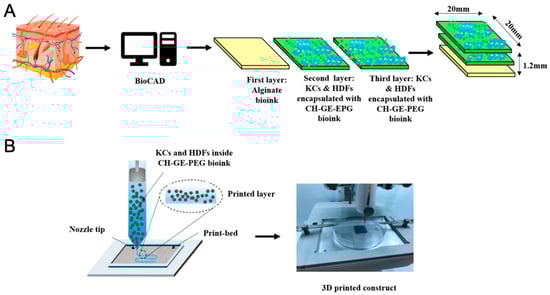 (A) Schematic illustration of the design of each layer of skin 3D-printed constructs. (B) 3D bioprinting of an alginate layer and KCs and HDFs encapsulated with CH–GE–PEG layers [89].