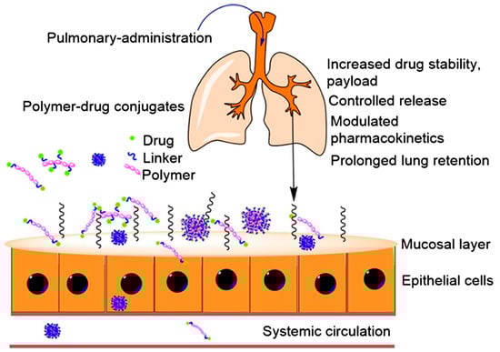 Schematic representation of pulmonary administration using polymer–drug conjugates (reproduced with permission from Marasini et al. [70], © 2017 Elsevier Ltd., London, UK).