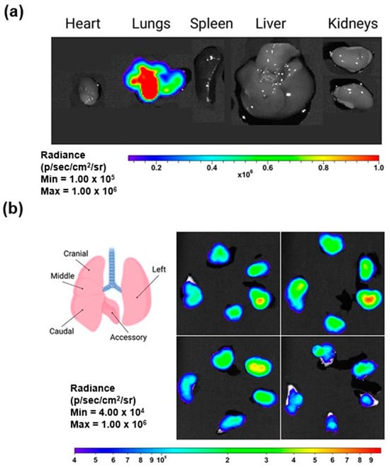 Images of LNP inhalation resulting in selective transfection within the lungs: (a) representative bioluminescent images of isolated organs demonstrate localized luciferase expression specifically in the lungs, and (b) LNP inhalation results in selective transfection within the lungs (reproduced with permission from Kim et al. [83], © 2022 American Chemical Society, Washington, DC, USA).