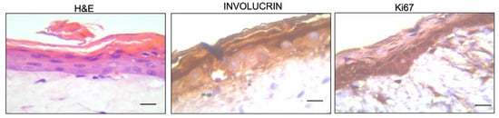 Hematoxylin and Eosin (H&E) staining and immunohistochemical staining of involucrin and Ki67 at 40× magnification of the two-layered (epidermal and dermal) reconstructed human skin model. The scale bar is 50 µm.