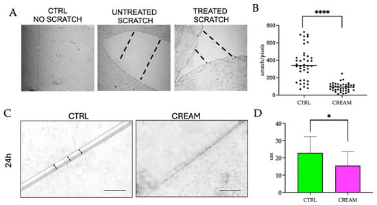 (A) Optical microscopic images of the paraffin-embedded sections at 40× magnification of the control model (CTRL), an untreated wound-scratched border and topical vitamin D2 + silver nanoparticle (VD2+AgNP) cream on a wound-scratched border after a 24 h incubation. (B) Statistical analyses of the untreated and cream-treated scratch border after 24 h. The black dots indicate the distance positioning of the individual replicates within the wound border. (C) Optical microscopic images comparing the surface diameter of the untreated and cream-treated scratch after 24 h at 20× magnification. The hatched lines in the images indicate the distance of the gap created by the incision close to the wound border (A) and along the length of the scratch (C). (D) Statistical analyses of the mean and standard deviation of the untreated and cream-treated scratch length diameter after 24 h. Significant differences were reported as follows: * p < 0.05, **** p < 0.0001.