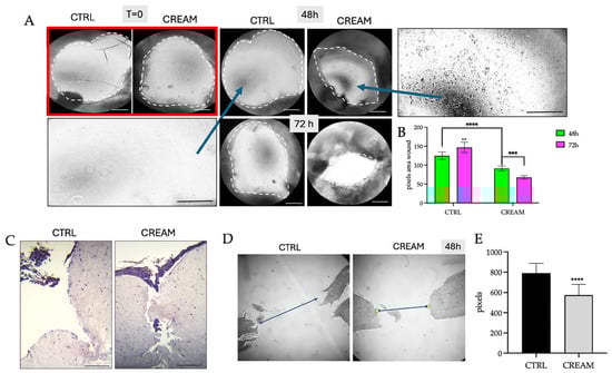 (A) Optical microscopic images (20× magnification) of reconstructed human skin models comparing the untreated (CTRL) and topical vitamin D2 + silver nanoparticle (VD2+AgNP) cream treatments at 0 (T = 0), 24 and 48 h after mechanical punch injury. The white hatched lines indicate the wound margins. Inlet: comparison of fibroblast migration in the dermal extracellular matrix within the wound area between the untreated CTRL and cream-treated models after 48 h. (B) Statistical analysis of the wound area in the CTRL and topical cream-treated models at 48 and 72 h after wounding. (C) Paraffin-embedded histological cross-sections of the full-thickness wound penetrating both the epidermis and dermis and (D) keratinocyte migration in the CTRL and topical cream-treated models, respectively, at 48 h post-wounding. The scalebar is 200 µm. (E) Statistical analysis of the histological images depicting wound area in untreated and topical cream-treated wounds after 48 h. (B,E) Results were reported as the mean ± SD and significant differences were reported as follows: ** p < 0.01, *** p < 0.001, **** p < 0.0001.