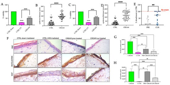 (A) Viability (MTT assay) and (B) epidermal thickness measurements made from Hematoxylin and eosin (H&E)-stained images comparing the control (CTRL) sham-irradiated models, the CTRL UVB-irradiated models (exposed to 50 mJ/cm2) and the cream models (cream applied 1 h prior to UVB exposure) after a post-irradiation period of 4 h. (C) Viability (MTT assay) and (D) epidermal thickness measurements made from H&E-stained images comparing the CTRL sham, UVB-irradiated and cream (cream applied immediately after irradiation) models after a post-irradiation period of 4 h. (E) Comparison of the epidermal thickness between the Prev (preventative) cream applied 1 h prior to UVB exposure) and Cur (curative, cream applied immediately after irradiation). The black dots represent individual measurements. (F) H&E, involucrin and Ki67 staining at 40× magnification of the reconstructed human skin (RHS) models. Comparisons were between the CTRL sham-irradiated, CTRL UVB-irradiated, the cream Prev and the cream Cur models, respectively, after a post-irradiation period of 4 h. The scalebar is 200 µm. Statistical analysis of (G) involucrin and (H) Ki67 expression from the histological images. All results were reported as the mean ± SD and significant differences are reported as follows: ** p < 0.01, **** p < 0.0001.