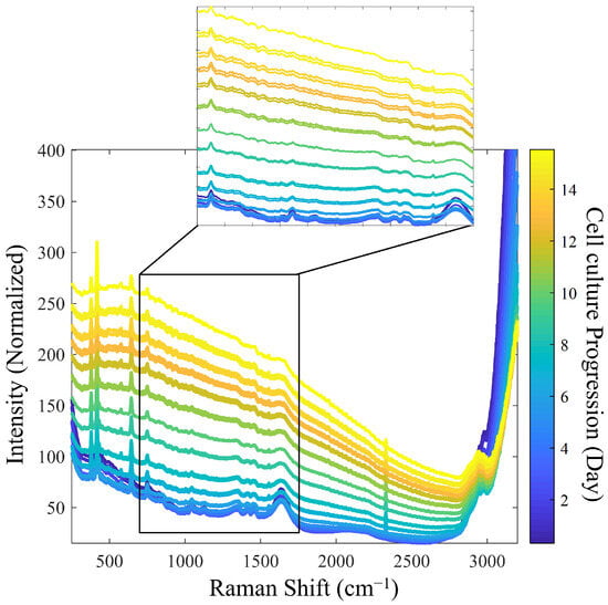 During the progression of cell culture, significant changes in Raman spectra were observed. As expected, as the cell density increased, the turbidity-related background increased, accompanied by a decrease in the intensity of individual Raman bands, likely due to a decreased depth of light penetration in the increasingly turbid medium [5]. Specifically, the Raman bands of water from the culture medium, observed at 1640 cm−1 and 3100–3250 cm−1, diminished as the process progressed. In addition, other intensity decreases were observed for the bands related to the sapphire optical windows at 386, 424, and 645 cm−1 and for those related to dissolved oxygen (O2) and nitrogen (N2) at 1552 and 2331 cm−1, respectively [28].