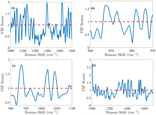 In addition to the previously mentioned figures of merit, it is important to verify that the chemometric model is based on relevant variables reflecting the Raman bands of the analyte. The variable importance in projection (VIP) score is used as a metric in PLS regression models, especially for highly dimensional and multicollinear data. The VIP score quantifies the weight of each variable to the model’s performance. In practice, a VIP score greater than 1 indicates that the variable makes a significant contribution to the PLS regression model. Once identified, these selected variables can be interpreted and highlight their true contribution to the model.
