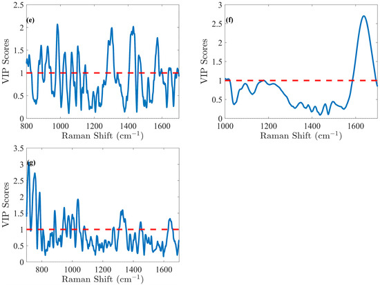 The VIP score obtained from the PLS model indicates the relative importance of the spectral region for (a) glucose (Glc), (b) lactate (Lac), (c) glutamine (Gln), (d) Glutamate (Glu), (e) IgG, (f) total cell density (TCD), and (g) viable cell density (VCD). These scores highlight the influence of each variable on the model’s predictive performance. VIP score > 1 means that the variable has a significant contribution.