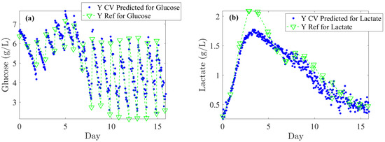 The literature generally indicates that glucose levels must be maintained above 1 g/L. In our off-line reference values, rapid depletion of glucose is observed over 24 h periods, dropping from 6 to 2 g/L (see Figure 5a). Considering process requirements, glucose levels could be regulated at an average of 5 ± 0.5 g/L. An RMSECV (%) of 12.8% supports this target as both feasible and satisfactory in terms of performance. For lactate concentration, a toxicity threshold of 2 ± 0.2 g/L should trigger alerts at this level. Consequently, an RMSECV (%) of 7.8% based on the upper limit is suitable for effective CHO culture management. Furthermore, monitoring IgG titer across all concentrations is essential to closely track cell productivity and process efficiency. Based on the instrument’s standard error, an RMSECV (%) of 9.3% is acceptable. Accordingly, as shown in Table 1, the RMSEC, RMSECV, and RMSEP errors meet the minimum required thresholds. Specifically, for glucose, the error remains consistently below 0.5 g/L; for lactate, it remains below 0.2 g/L across RMSEC, RMSECV, and RMSEP; and for IgG, the error stays below 0.1 g/L for both RMSEC and RMSEP.