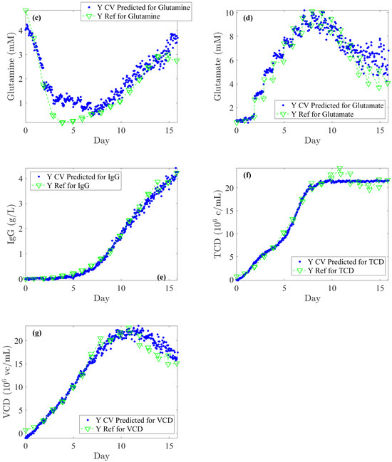 Once PLS models are optimized on Batches 1, 3, 4, and 5, they are used on the test subset (Batch 2) for back-prediction: comparison of off-line reference values (blue dots) and Raman spectra-based predictions (green lines and downward-pointing triangle) for: (a) Glucose, (b) Lactate, (c) Glutamine, (d) Glutamate, (e) IgG, (f) TCD (Total Cell Density), and (g) VCD (Viable Cell Density).