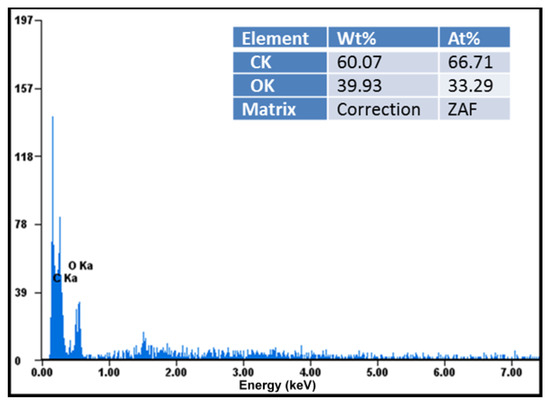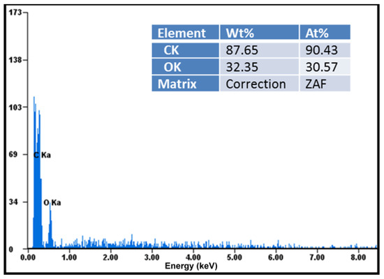 Elemental analysis demonstrated that these compounds were chemically pure, with no chemical elements found other than carbon, oxygen in large quantities visible in the diagrams, and hydrogen in small quantities not indicated in the diagrams (Figure 4). EDAX analysis showed that the amount of carbon detected in the samples almost doubled in the case of the ketoprofen–beta cyclodextrin complexes (2:1) as a result of carbon added by the two molecules of ketoprofen included in the cyclodextrin structure (Figure 5).