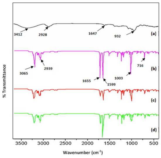The peak at 1599 cm−1, which was specific for the C=C bond, started at the ketoprofen–β-cyclodextrin (1:1) complex and ended at the ketoprofen–β-cyclodextrin (2:1) complex. The C=O bond decreased the peak at 1655 cm−1 for all complexes, and the -CH bond similarly decreased the peaks at 716 cm−1, 1003 cm−1, and 3065 cm−1, indicating the same ketoprofen inclusion efficiency (Figure 6).