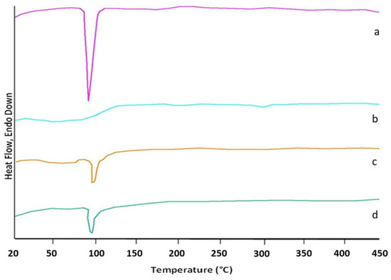 In addition, in the DSC curve of β-cyclodextrin there was an endothermic peak that characterized the melting process of the substance at approximately 298 °C. In the two situations with the complexes, an essential decrease or total disappearance of the endothermic effects related to the melting of the formed ketoprofen–β-cyclodextrin complexes was observed, which indicated the interaction of ketoprofen with β-cyclodextrin and the formation of the complexes (Figure 7). The important peak areas were—862.42 for the ketoprofen, —35.21 for the β-cyclodextrin, —474.33 for the ketoprofen–β-cyclodextrin (1:1), and 543.32 for the ketoprofen–β-cyclodextrin (2:1). The Tpeak values for ketoprofen, β-cyclodextrin, ketoprofen–β-cyclodextrin (1:1), and ketoprofen–β-cyclodextrin (2:1) were 95.97 °C, 297.94 °C, 98.42 °C, and 97.81 °C. The enthalpy values for ketoprofen, β-cyclodextrin, ketoprofen–β-cyclodextrin (1:1), and ketoprofen–β-cyclodextrin (2:1) were 44.34 j/g, 1.81 j/g, 24.38 j/g, and 27.93 j/g.